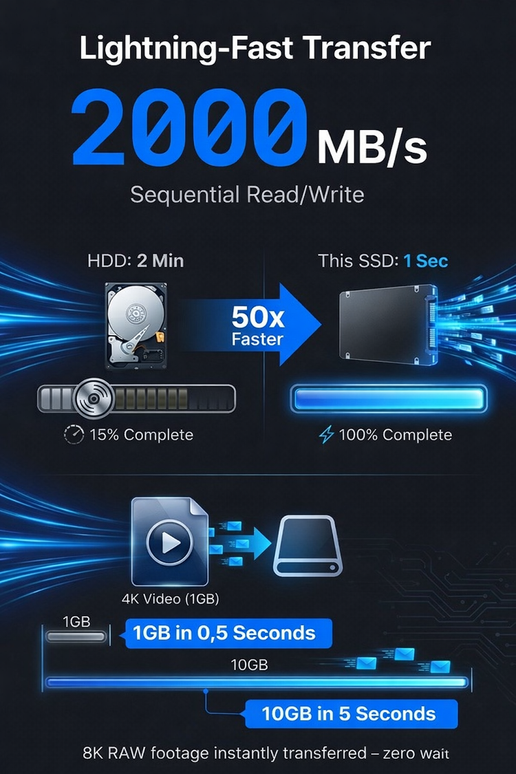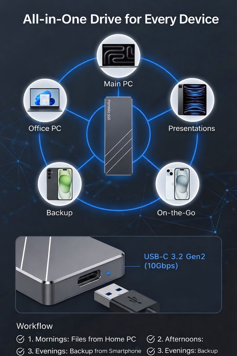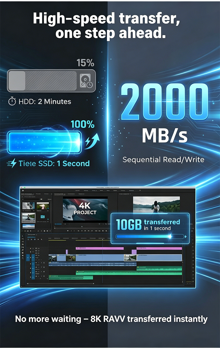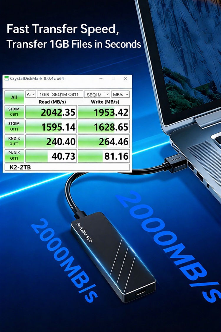 Transfer speeds reach up to 1GB per second! ⚡🚀 It supports PC Express and NVMe protocols, and is equipped with a USB 3.2 Gen 2 interface, Type-C dual mode. It can connect to your camera, laptop, tablet, or mobile phone. 📸💻📱Due to its compact and portable size, you can easily carry it around on workdays. 💼